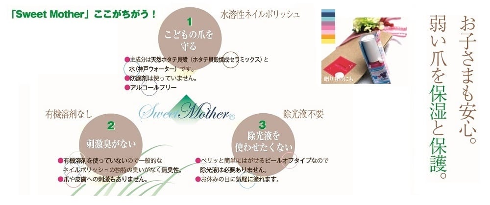 【ママとキッズのためのネイルポリッシュ】 ホタテの貝殻と神戸ウォーターが主成分。 有機溶剤、界面活性剤、乳化剤、防腐剤不使用。 お子様でも安心してお使いいただけます。 色素を一切使わずピンク・オレンジがキラキラ輝く高品質なラメを使った美しい他にはないネイルポリッシュ。 変色や傷んだツメを隠してカバーします。 ツメが弱い方にも喜んでいただけるSweet Mother自慢の とても美しくゴージャスなお色です。 ■■ 彩式ねいるのお取り扱いについて ■■ 「彩式ねいる」は一般の有機溶剤が入ったマニュキュアとは全く違う商品です。 お取り扱いについては下記をお読みいただくようお願いいたします。 ●塗る前に 爪の汚れを綺麗に洗い流して、しっかりと乾燥させてからお塗りください。 ●塗り方 一般のマニュキュアとは異なりサラサラとした液なので、ハケにたっぷり含ませてお塗りいただきますと、液だれしダマになることがありますので、必ずビンの口でハケをしっかりしごき、 薄く何度か塗り重ねてお使いいただくことをお勧めいたします。 またハケに力を入れ押し付けて塗ると塗った後に筋が入ることがありますのでハケは力を入れずに優しく滑らせるようにお塗りください。 ●落とし方 ピールオフタイプ。 お湯に5分程つけ甘皮側からシールをめくるようにペリっとはがせます。 ●注意点 ※お肌に合わない場合は、ご使用をおやめください。 ※一般のマニュキュアに比べ、石鹸や洗剤(食器用、手洗い用、洗顔用、シャンプー等)に含まれ る成分により落やすいため、しっかり乾かして(3分程度)いただくようお願いいたします。 ※ホタテ微粉末がたっぷり入っているため保管状態により沈殿することがありますが、品質に は問題ございません。軽く振ってお使いください。 ※使用後は、しっかりフタをお閉めください。 ※高温や直射日光のあたる場所、また極端な低温の場所に保管することはお避けください。 ※幼児の手の届かない場所に保管するようお願いいたします。 〇ミネラルたっぷり神戸ウォーター使用 品 名:コッパー 品 番:KLC-O 01 内容量:5.5㎖ 全成分 ・アクリル酸アルキルコポリマー ・ポリウレタンー34 ・水 ・マイカ ・合成金雲母 ・ホタテ貝殻 ・ケイ酸(Na/Mg) ・キサンタンガム ・酸化スズ ・酸化チタン ・酸化鉄 〒650-0004 神戸市中央区中山手通1丁目22-8 クイーンズビル2階 TEL : 078-778-5368